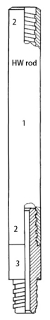 | HW drill rod configuration: 1-HW drill rod overview 2-HW drill rod body with box thread 3-HW drill rod coupling with pin thread